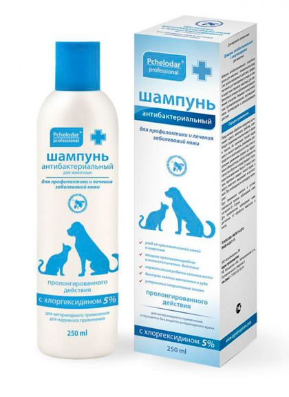 Шампунь Pchelodar хлоргексидиновый с антибактериальным эффектом применяют собакам и кошкам для профилактики и лечения: